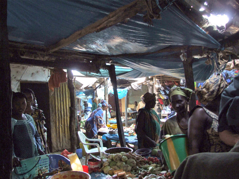 I Senegal taler man fransk. Deres veje er bedre end i Gambia, men Senegal får også stadig en del støtte fra Frankrig. Lige efter grænsen stopper vi i en by og går en tur i byen for at opleve stemningen. Det mest spændende ved denne tur, var turen gennem markedet.
