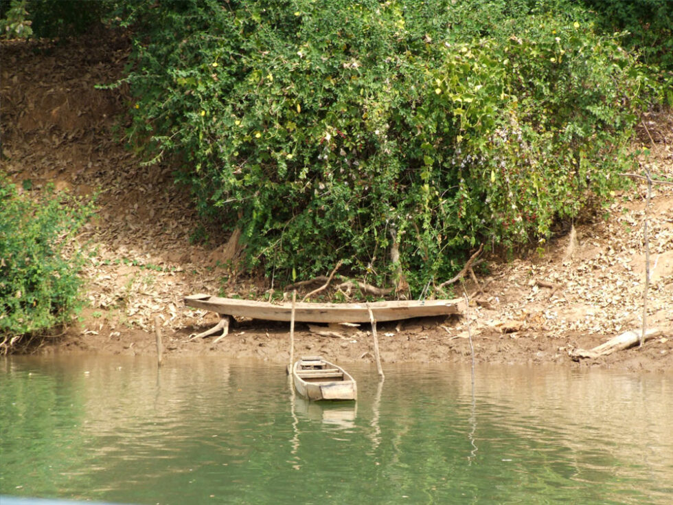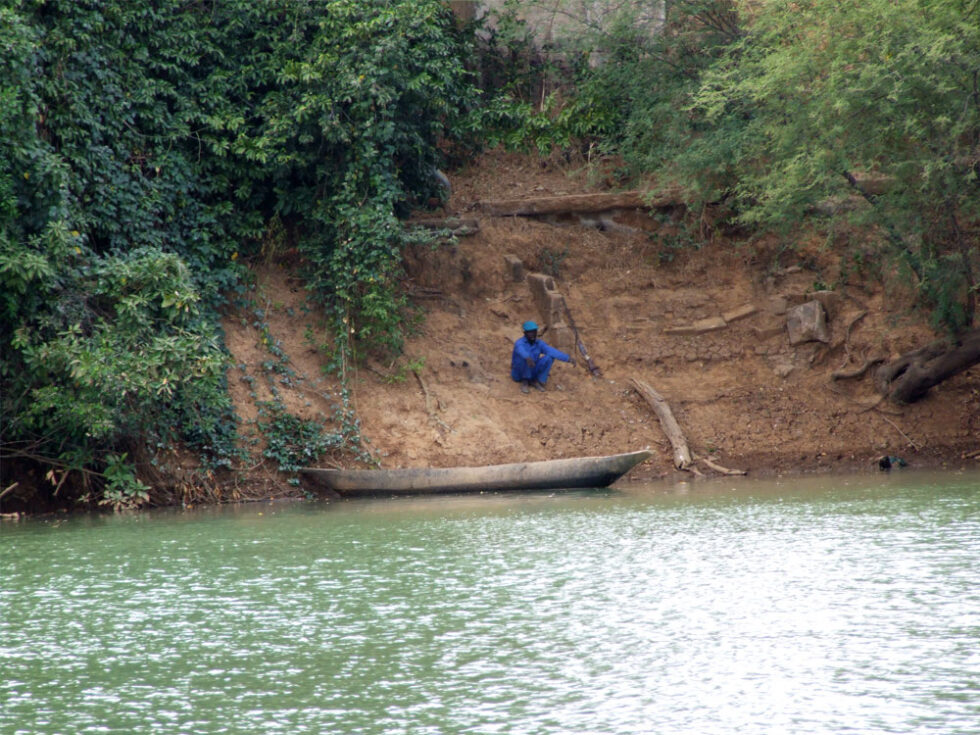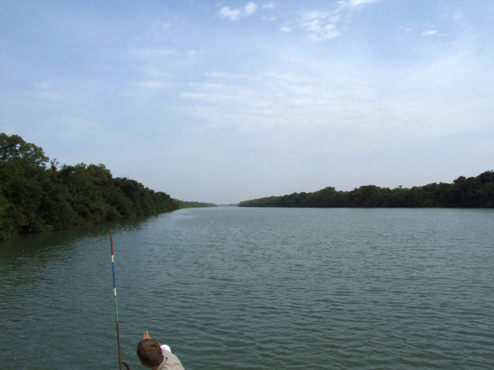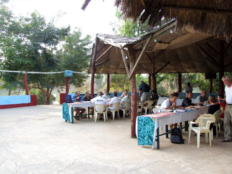 Morgenmaden i denne smukke og fredsfyldte camp bestod af omelet, vandmelon, banan, ost, kaffe samt gambianske pandekager, der smager som en blanding af æbleskiver og dognuts. De er runde og smager ganske fortrindeligt. Vi pakkede vores ting, satte os til rette i bussen, og kørte en times tid til vi kom til en båd, som vi skulle sejle op ad Gambia-floden i. Det var en meget smuk og afslappende tur – dejligt at slippe for alle bump og rystelser i bussen i en dags tid. Der var kolde øl og vand om bord og vi fik en rigtig god frokost (ris, løgsovs, salat, brød). Om bord fik vi også serveret grøn the.