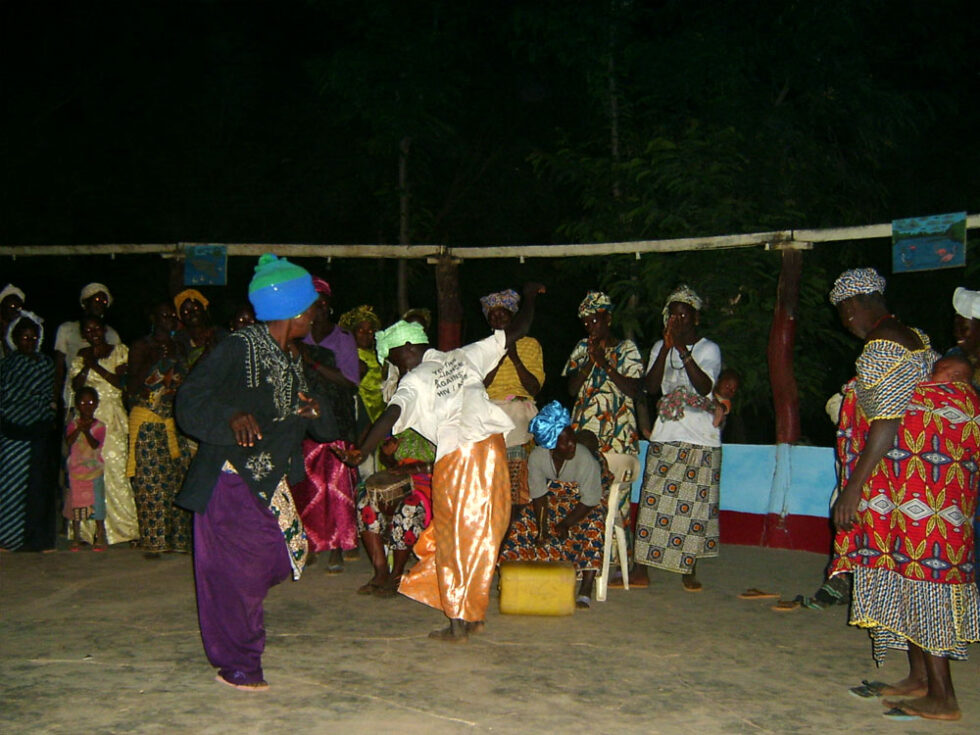 Om aftenen var der igen den store buffet. Denne gang med en lækker suppe til forret, herefter ris, løgsovs og kål efterfulgt af vandmeloner og bananer til dessert. Under desserten hørte vi kvindesang i det fjerne. Det blev kraftigere og kraftigere, og pludselig ud af mørket kom ca. 70 kvinder og børn og dansede for os. De fik også lokket nogle af os ud at danse. Det er uhyggeligt svært at danse til de trommerytmer.