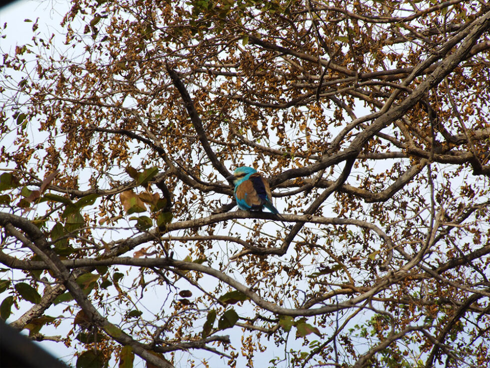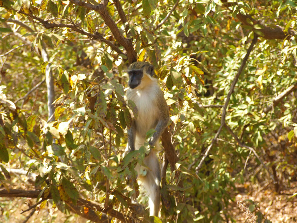 Tidlig næste morgen – efter en lækker morgenmad bestående af gambianske pandekager, frugt, brød og smør – gik turen mod Senegal og natioalparken Niokolo-Koba. Ved grænsen stopper vi for at stemple pas og “smøre” grænsevagterne, så det hele glider lidt nemmere. Ved grænsen får vi lov til at strække benene og vi får øje på denne kamæleon oppe i et træ. Efter en vandretur på nogle danske turister kommer den op i træet igen. En gammel overtro siger, at hvis man kører hånden ned langs kamæleonens hale får man en smuk håndskrift – ingen af os har dog bemærket nogen forskel…