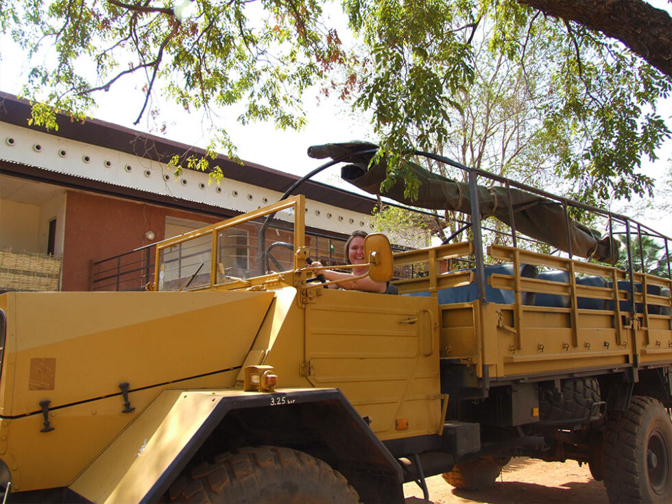 Herefter var vi en lille gruppe, der tog på jeeptur rundt i området. På ladet af en jeep fornæmmer man meget mere af Afrika end fra en bus. Vi kørte rundt i næsten 2 timer, gennem smukke landskaber, bakkede grusveje, mens vi nød naturen. Vi stoppede ved et stort træ, og vores guide sprang ud af bilen og plukkede træets frugter til os. Inde i frugterne gemmer sig en natursvamp – ja, sådan én man bruger i sit bad. Tænk engang, at man kan plukke badesvampe fra træerne i Afrika – fantastisk.