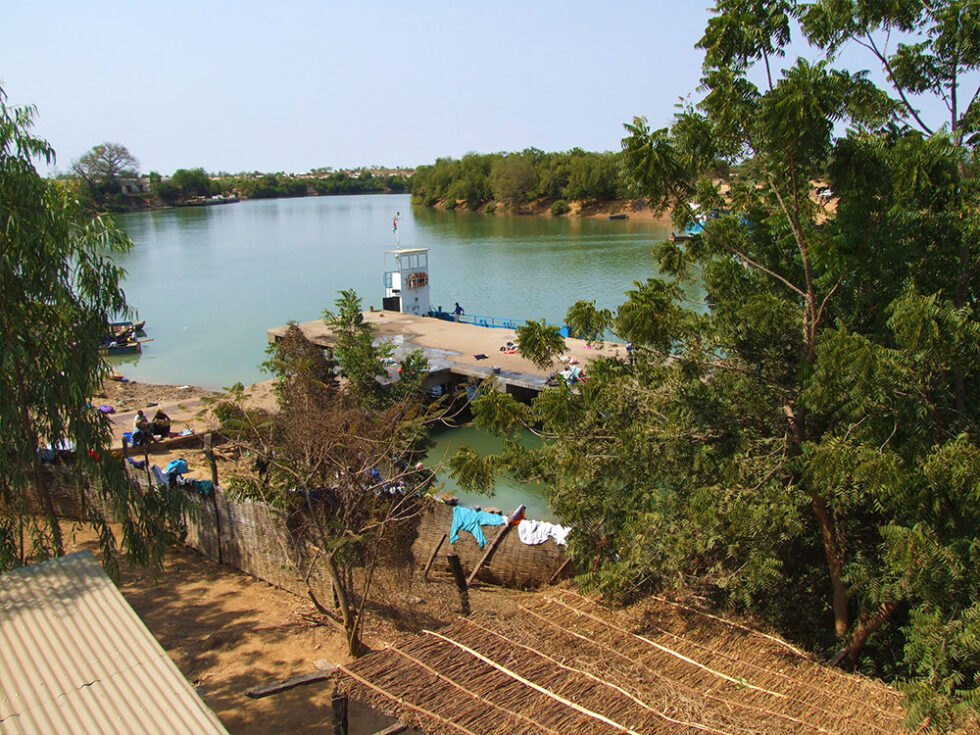 Efter den obligatoriske velkomstdrink – denne gang hibiscus-juice – blev vi indkvarteret i vores hytter. Her var også rindende koldt vand, men ingen døre indenfor, dog turens første spejl – et meget lille og rundt spejl. Vi slappede af en times tid og mødtes med vores guider ved flodbreden. Vi ville nemlig gerne over at se byen på den anden side af floden.