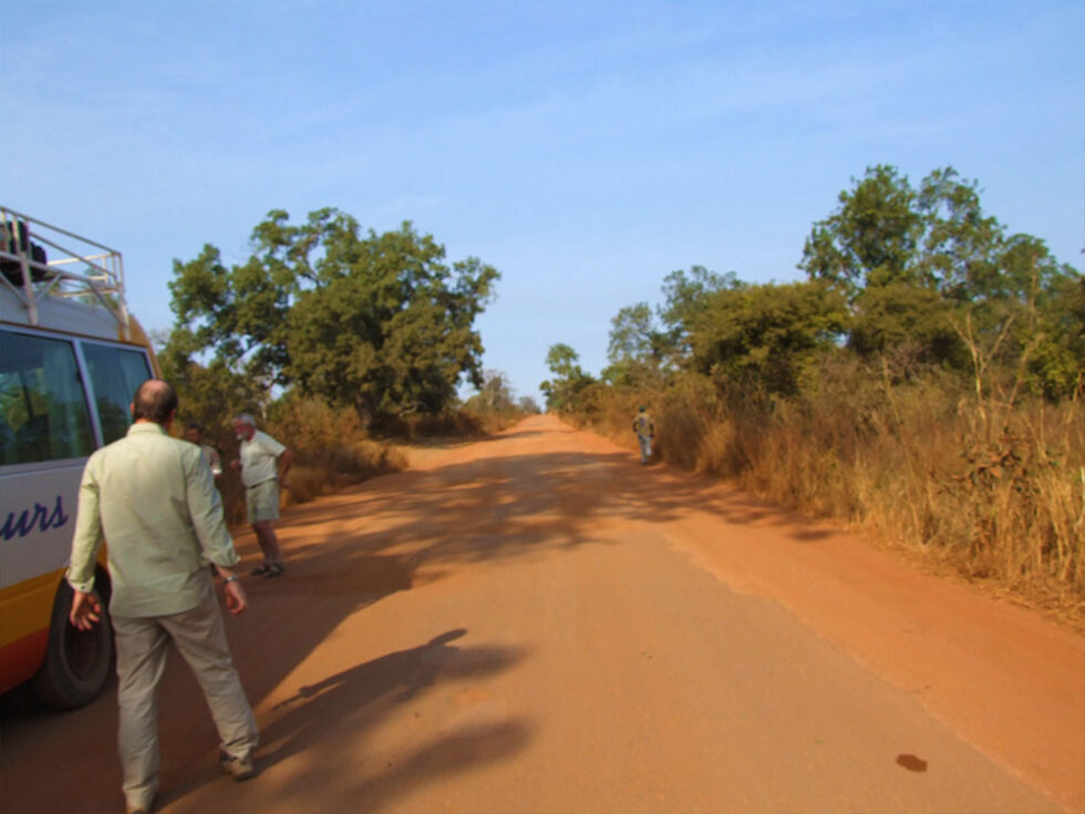 Dagen efter skulle vi meget tidligt op og køre ca. 480 km. Det tog omkring 12 timer på Senegals og Gambias grusveje. På vej ud af Niokolo Koba nationalpark stoppede vi et par gange for at se på naturen. Vi spiste frokost ved Basse Santa Su – en rigtig dejlig frokost med ris, græskar, peanuts, løgsovs, kødsovs, pasta og de obligatoriske små bananer til dessert. Det var en meget lang tur. Vejene skiftede mellem asfalt og jordveje – mellem store og kæmpestore huller. Nogle steder føltes det som om vi kørte på skildpadder. Vi nåede først til Tendaba Camp på Gambia-flodens sydlige bred efter solnedgang.
