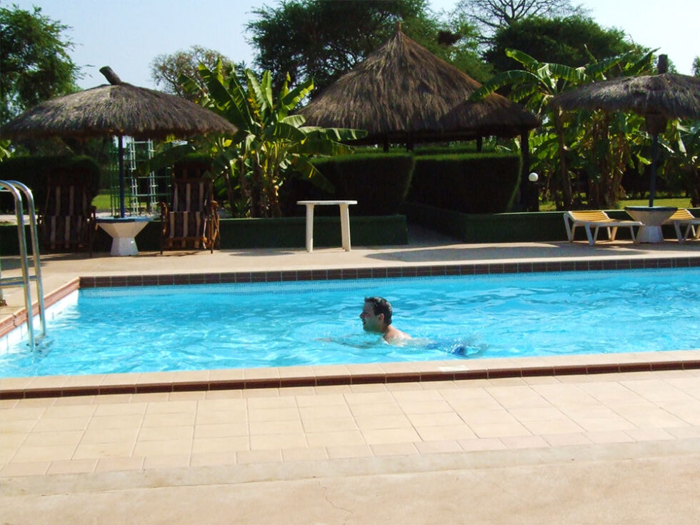 Efter turen var det tid til at rejse videre. Vi kørte til den sidste camp på turen, nemlig Sindola Camp i Kanilai. En meget smuk Camp, der er ejet af Præsidenten i Gambia. Det skal lige nævnes, at op til denne camp kørte vi på det bedste asfalt i hele Gambia. På campen var der luksus over al forventning, samt frodigt og meget grønt . Vi var alle en tur i poolen, lå på solsenge med madras, fik udleveret håndklæder og kolde drinks på pool-kanten. Ca. en times tid varede denne luksus, så skulle vi på farten igen.